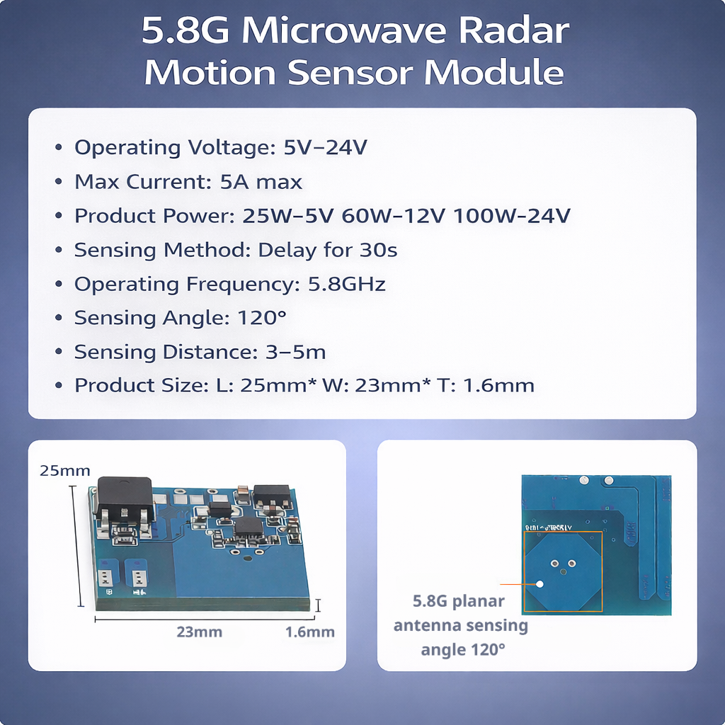 This 5.8G microwave radar motion sensor is designed for low-voltage LED lighting systems (DC 6–24V).