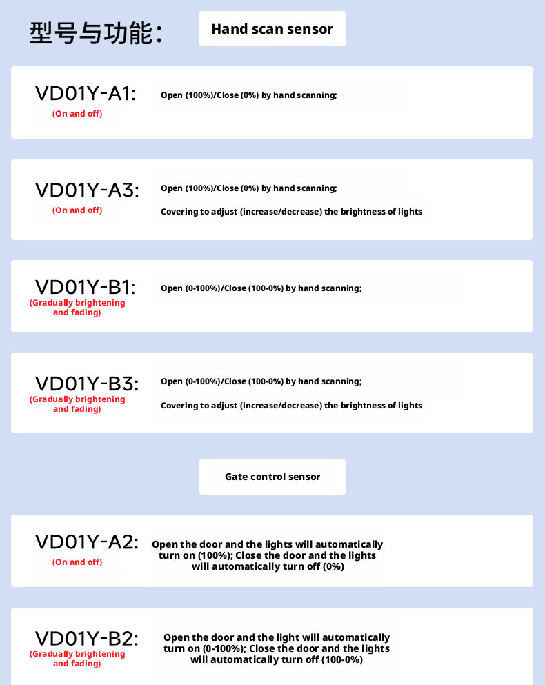 Different models provide different sensing and dimming functions. Please confirm the required model before ordering.
