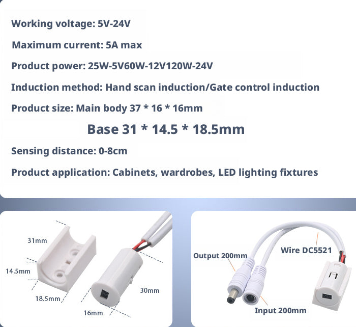 Este interruptor de sensor de onda manual infravermelho DC 5-24V foi projetado para aplicações de iluminação LED em armários, guarda-roupas e móveis.